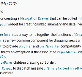 Android 썸네일형 리스트형 [android]Changes for v4 Support Library _ revision 13 (May 2013) - Android Support library v4에서 바뀐 부분 정리 2013.05 http://developer.android.com/tools/extras/support-library.html • Support library v4 변경사항 - 창의 가장자리에서 끌어 당기는 Navigation Drawer인 DrawerLayout Widget 추가. - 다양한 화면크기에 적용 가능하며, 상세내용을 표시하는 view를 위한 SlidingPaneLayout Widget 추가. - DrawerLayout과 ActionBar의 기능을 연결하는 ActionBarDrawerToggle 추가. - 상위 view에서 view를 드래그하기 위한 새 구성요소로 ViewDragHelper 추가. - Scroller와 O.. 더보기 [android]Button의 Drawable을 SourceCode로 작성 drawable의 state를 작성할 경우 xml과 마찬가지로 순서에 영향을 받기 때문에 반드시 순서대로 작성 (normal이미지는 항상 마지막에 작성) 1. activity에서 구현 할 경우. 2. Button을 상속받았을 경우 3. ImageButton을 상속받았을 경우 더보기 [android]Bitmap to NinePatch NinePatch 용량 최적화는 sdk/tools/draw9patch.bat 이용 1. 나인패치 이미지 준비 - test.9.png 2. 버튼 Listener 3. Image 설정 부분 code를 xml로 정의해서 사용할 수도 있음(drawable폴더 생성 후 작성) 더보기 [android]convert intent to string(uri) _ intent를 String(Uri)값으로 변환하기 String uri = intent.toUri(flag); //해당 intent를 Uri값으로 변환 flag값으로는 0 또는 Intent.URI_INTENT_SCHEME를 달아준다. Intent.URI_INTENT_SCHEME::parseUri와 toUri를 구분하는 구분자. return된 uri의 action=android.intent.action.VIEW;부분은 적어주지 않으면 해당 view를 들고 가기 때문에 지워준다.(byte제한 떄문에 가능한한 지워줌) 더보기 [android]view 절대좌표 구하기 더보기 [android]manifest permission constants java.lang.Object↳android.Manifest.permissionSummaryConstantsStringACCESS_CHECKIN_PROPERTIESAllows read/write access to the "properties" table in the checkin database, to change values that get uploaded.StringACCESS_COARSE_LOCATIONAllows an app to access approximate location derived from network location sources such as cell towers and Wi-Fi.StringACCESS_FINE_LOCATIONAllows an app to access preci.. 더보기 [xml]TextView _ inputType public interfaceInputTypeandroid.text.InputTypeKnown Indirect SubclassesEditorInfoClass OverviewBit definitions for an integer defining the basic content type of text held in an Editable object. Supported classes may be combined with variations and flags to indicate desired behaviors.SummaryConstantsintTYPE_CLASS_DATETIMEClass for dates and times.intTYPE_CLASS_NUMBERClass for numeric text.intTYP.. 더보기 이전 1 2 3 다음
